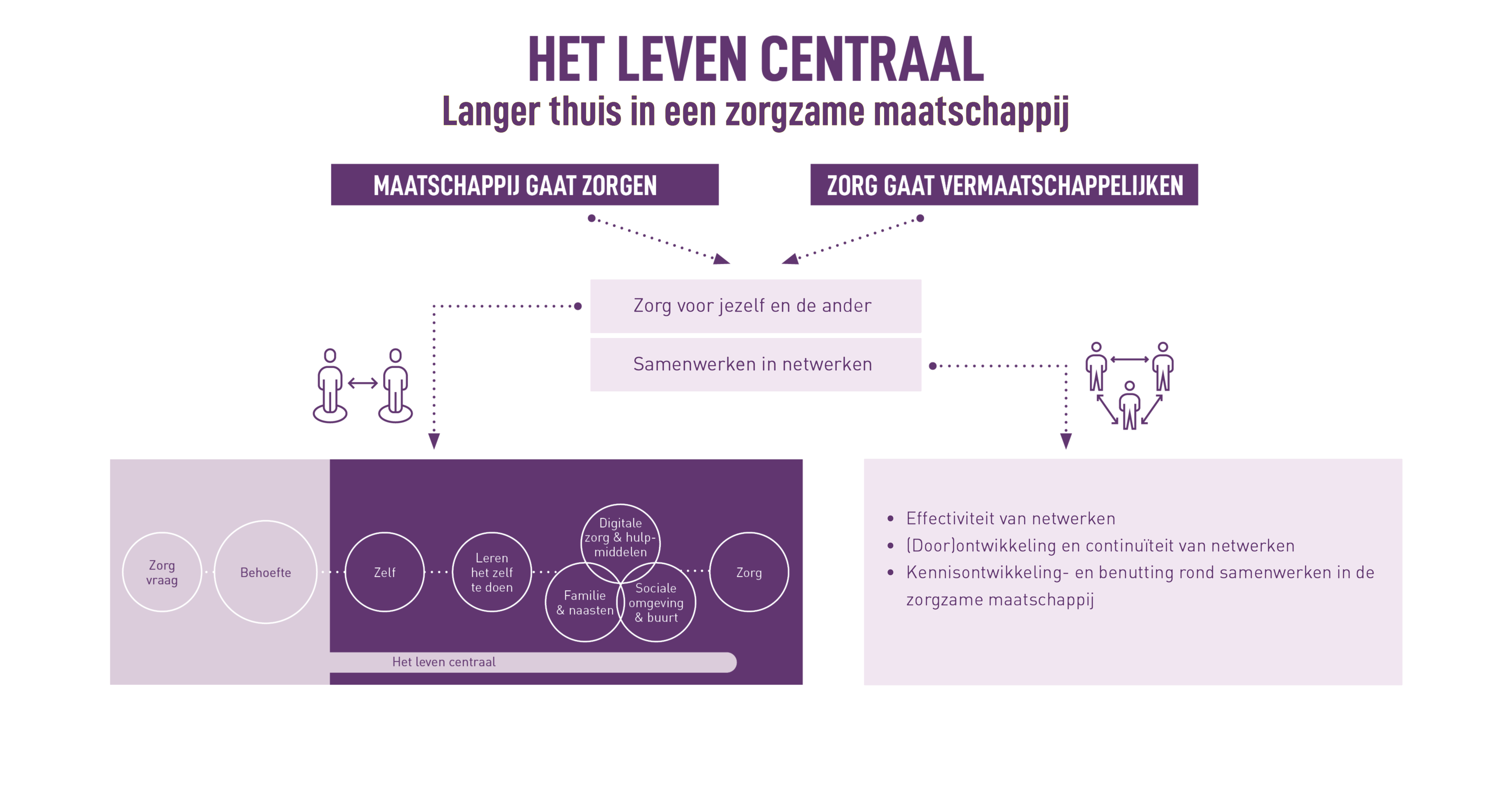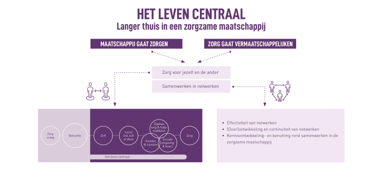 Infographic met de titel 'Het leven centraal – Langer thuis in een zorgzame maatschappij'. Bovenaan staan twee pijlen: links 'Maatschappij gaat zorgen' en rechts 'Zorg gaat vermaatschappelijken', die beide wijzen naar de kern: 'Zorg voor jezelf en de ander' en 'Samenwerken in netwerken'. Onder deze kern staan pictogrammen van mensen die verbonden zijn met stippellijnen naar een schema. Dit schema toont een reeks cirkels met de woorden: